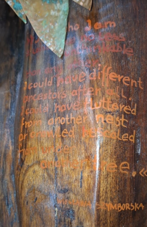 Jednym z elementów pracy jest umieszczony na jej powierzchni fragment wiersza Wisławy Szymborskiej „W zatrzęsieniu” stanowiący głęboką medytację na temat natury, determinizmu i prób poszukiwania szczęścia w warunkach, w których musimy egzystować, a na które zazwyczaj nie mamy wpływu.