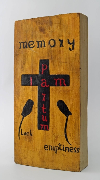Praca Memory, Luck, Emptiness wykonana została z fragmentu drzewa. Oszczędna kompozycja umieszczona na prostokątnej płaszczyźnie przeciętego wzdłuż drewna składa się z kilku słów i znaków graficznych, niosąc wyraźnie obrazoburczy przekaz. Czerń, tradycyjnie powiązana w chrześcijaństwie z nieczystością i grzechem, kontrastuje ze złotem, kolorem świętości i boskości. Litery zapisane w miejscu poziomej belki krzyża trawestują znany z historii biblijnej skrót INRI, a zapisane w pionie nazwisko artysty przypomina dalekie echo sylwetki ludzkiej. Symbol Męki Pańskiej przekształcony zostaje w sygnaturę artysty (krwistoczerwony napis ,,jestem Partum”, ang. ,,I am Partum”). Świętokradczy gest dopełniają czarne plamy, którym przypisano słowa ,,szczęście” (ang. ‘luck’) i ,,pustka” (ang. ‘emptiness’), być może symbolizujące kwiaty lub postaci Maryi, matki Jezusa, i Marii Magdaleny, widocznych pod krzyżem w historycznych przedstawieniach tematyki pasyjnej. Kompozycję zamyka od góry słowo ,,pamięć, wspomnienie” (ang. ‘memory’). Dzieło przypomina tablicę nagrobną. Łączy prześmiewczość, autoironię i egzystencjalny niepokój. W kontekście czasu powstania, czyli początku lat osiemdziesiątych – okresu wzmożonych represji politycznych i wzmocnienia autorytetu Kościoła Katolickiego w polskim społeczeństwie – praca Partuma przybiera formę współczesnego epigramatu.