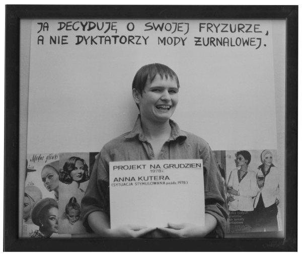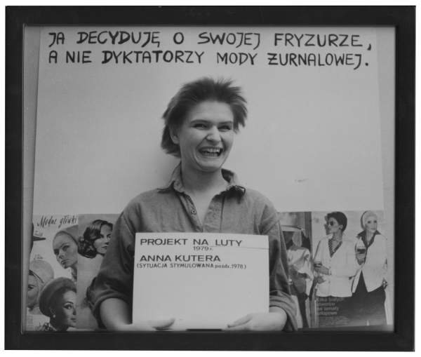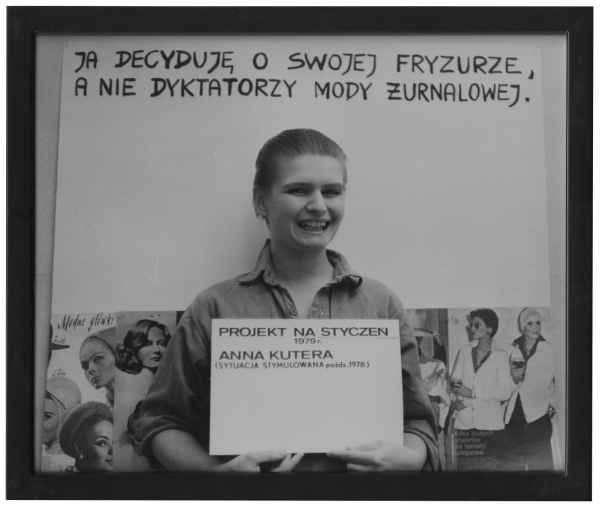 Fryzury I-IV pochodzą z cyklu Sytuacje stymulowane rozwijanego przez artystkę w latach 1976–1989. Do tej serii należał również performans wykonany przez Kuterę na plenerze w Osiekach 16 września 1981 roku. Polegał on na prowadzeniu dialogu ze sobą. Elementem działania był ekran telewizora, na którym wyświetlano wideo pokazujące artystkę zwracającą się wprost do kamery rejestrującej jej wypowiedź. Dzieło dotyczyło zagadnienia prawdy w obliczu rosnących w siłę przekazów medialnych. Proponowało namysł nad statusem ontologicznym podmiotu, rozszczepionego na różne formy przekazu: odczytywany tekst autorski, fizyczną obecność podczas performansu, filmowe zapośredniczenie, rejestrację fotograficzną działania. Zaktualizowany reenactment performansu, czyli jego ponowne odegranie, odbył się podczas gali otwarcia wystawy Otwieranie. Plenery koszalińskie w Osiekach 1963–1981 w Filharmonii Koszalińskiej 26 listopada 2023 roku. Jego integralną część stanowiły pokazywane na wystawie cztery zdjęcia artystki.