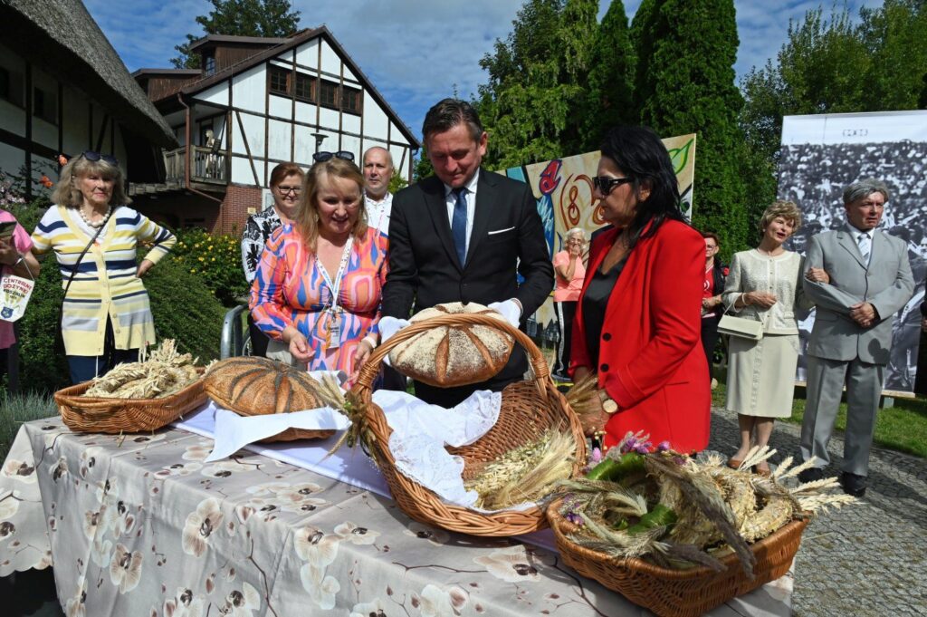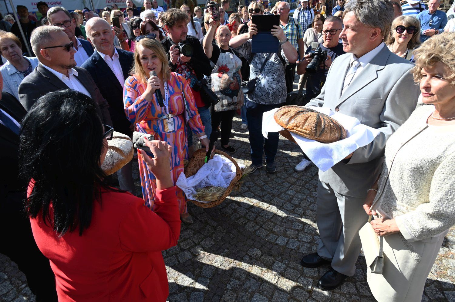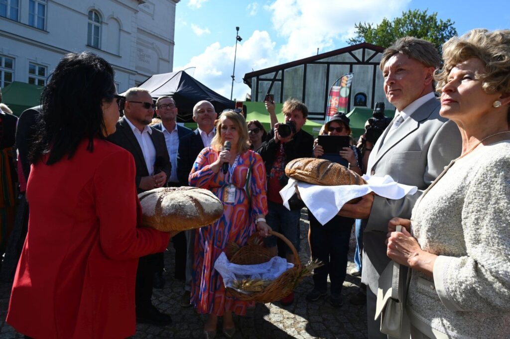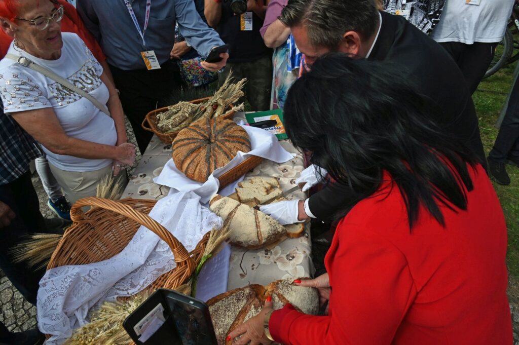 Następnym punktem programu był tradycyjne podzielenia się dożynkowym chlebem. Tomasz Sobieraj zrobił na bochnie znak krzyża i wspólnie z Małgorzatą Chodkowską dzielili chleb między zebranych, którzy chętnie się częstowali.
