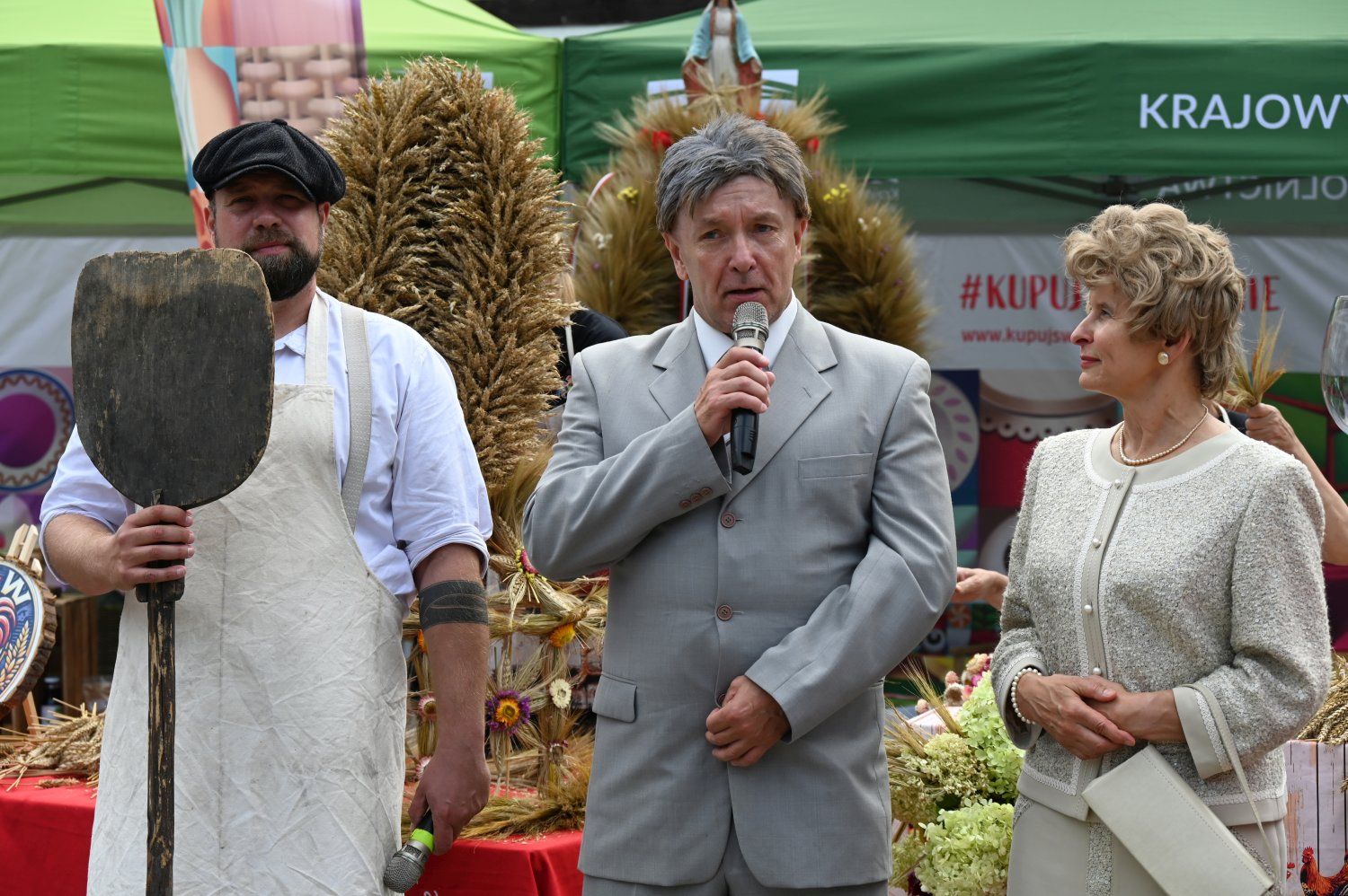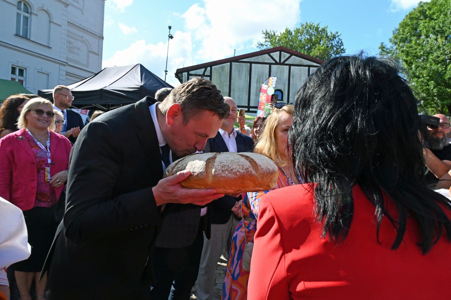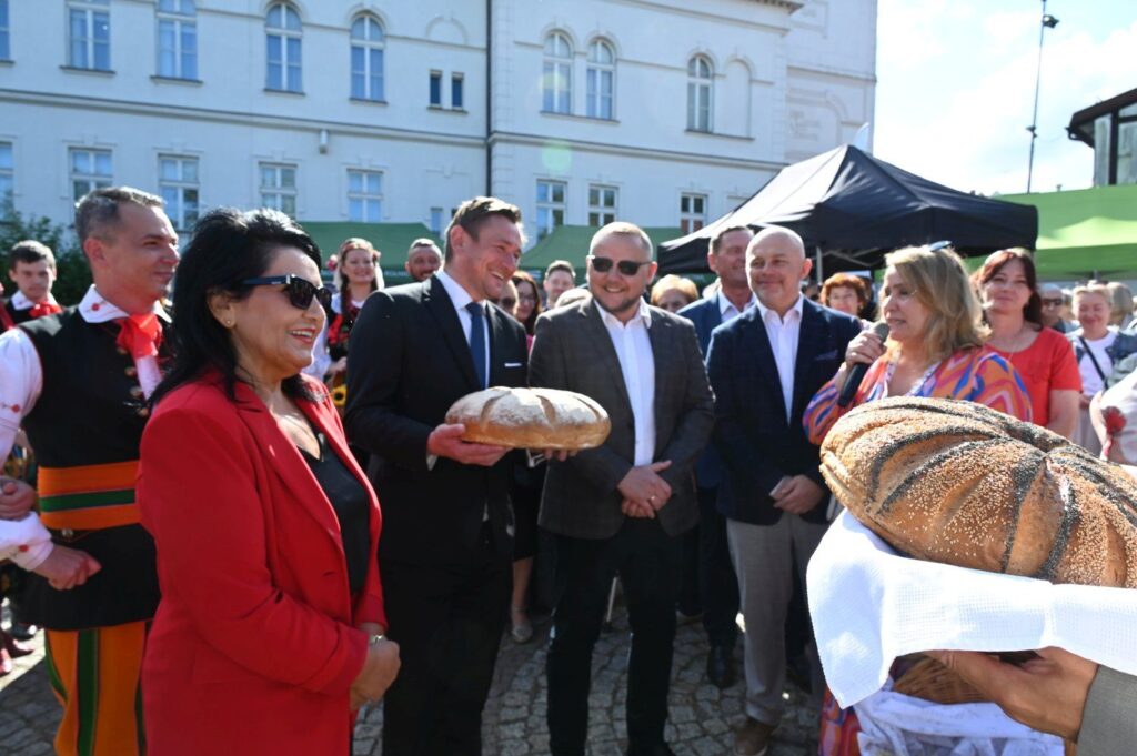 Następnym punktem programu był tradycyjne podzielenia się dożynkowym chlebem. Tomasz Sobieraj zrobił na bochnie znak krzyża i wspólnie z Małgorzatą Chodkowską dzielili chleb między zebranych, którzy chętnie się częstowali.