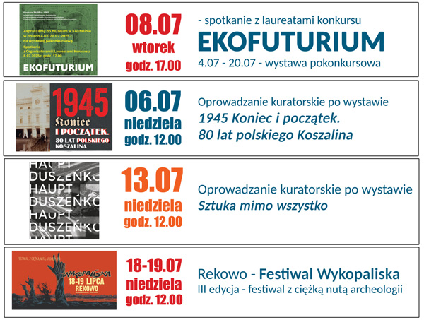 Przypominamy również, że w okresie wakacyjnym – od 1 lipca do 31 sierpnia – wydłużamy czas otwarcia Muzeum w Koszalinie i Zagrody Jamneńskiej. Wszystkich zainteresowanych zapraszamy w nasze progi od wtorku do niedzieli, w godzinach od 10:00 do 18:00.