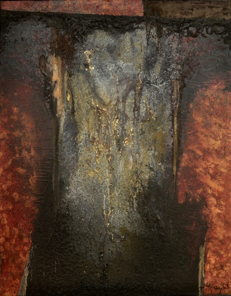 The painting Untitled, painted during the first Osieki Plein Air, betrays the painter’s interest in formless matter and its mysticism. The work was the forerunner of the cycles Totems of Bialystok (1964) and Totems of Żoliborz (1966), which refer to the motif of the tree and images of mythical ancestors. The works in these cycles gave shape to archaic symbols and were associated with religious worship. The totem motif was explored by numerous post-war artists; it was seen as a regenerative force to work through the existential pain left by the horrors of wartime destruction and the dehumanising ideology of rationalism. This painting from the Osieki Collection can be seen as an example of “pretotemic” abstraction, depicting matter in search of form. The painterly substance seems to thicken and solidify before the viewer’s eyes. The austere representation in browns and blacks has traces of prefiguration, portraying the sign of a human figure or a tree, perhaps a synthesis of these, as an echo of the artist’s repeated reinterpretation of the crucifixion theme. The painting’s message is both fatalistic and cosmogonic, as it shows being on the boundary of existence – its erasure or preorganisation.