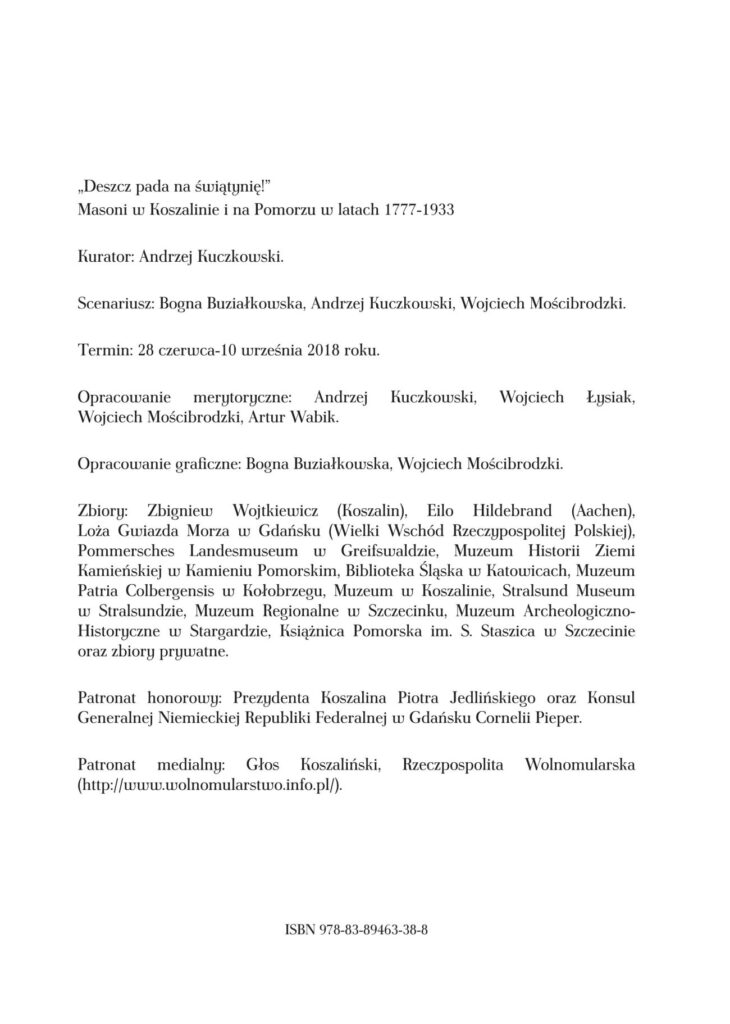 Publikacja wydana przy okazji organizacji wystawy o tym samym tytule, która prezentowana była w Muzeum w Koszalinie w okresie od 28 czerwca do 10 września 2018 roku (link do zakładki z opisem wystawy „Deszcz pada na świątynię…”).