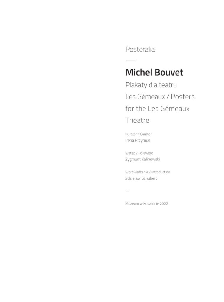 Katalog wystawy czasowej „Michel Bouvet. Plakaty dla teatru Les Gémeaux”, która była pierwszą wystawą z serii Posteralia i którą prezentowaliśmy w Muzeum w Koszalinie w okresie od 21 kwietnia do 12 czerwca 2022 roku.