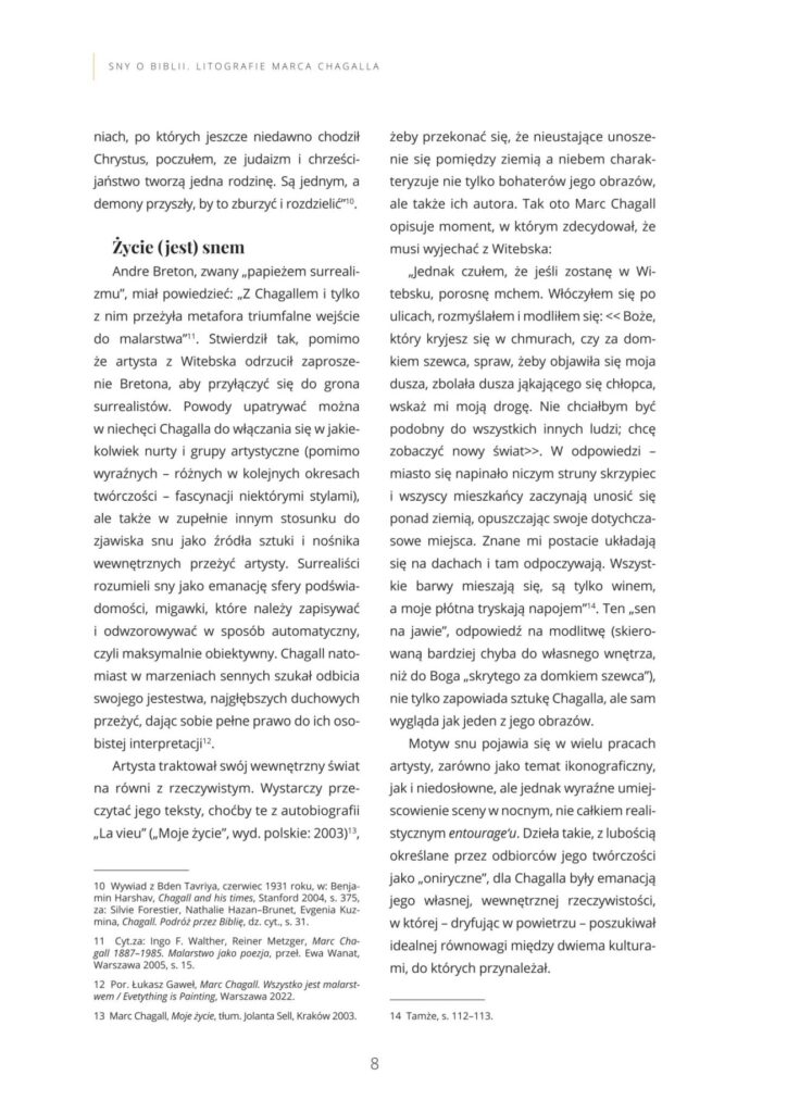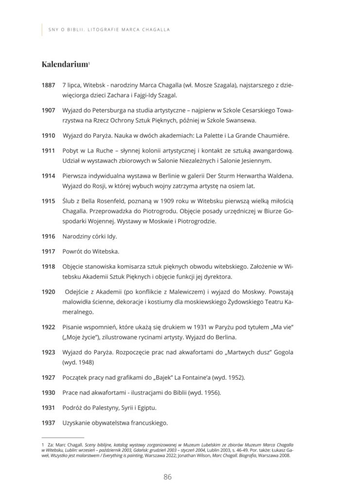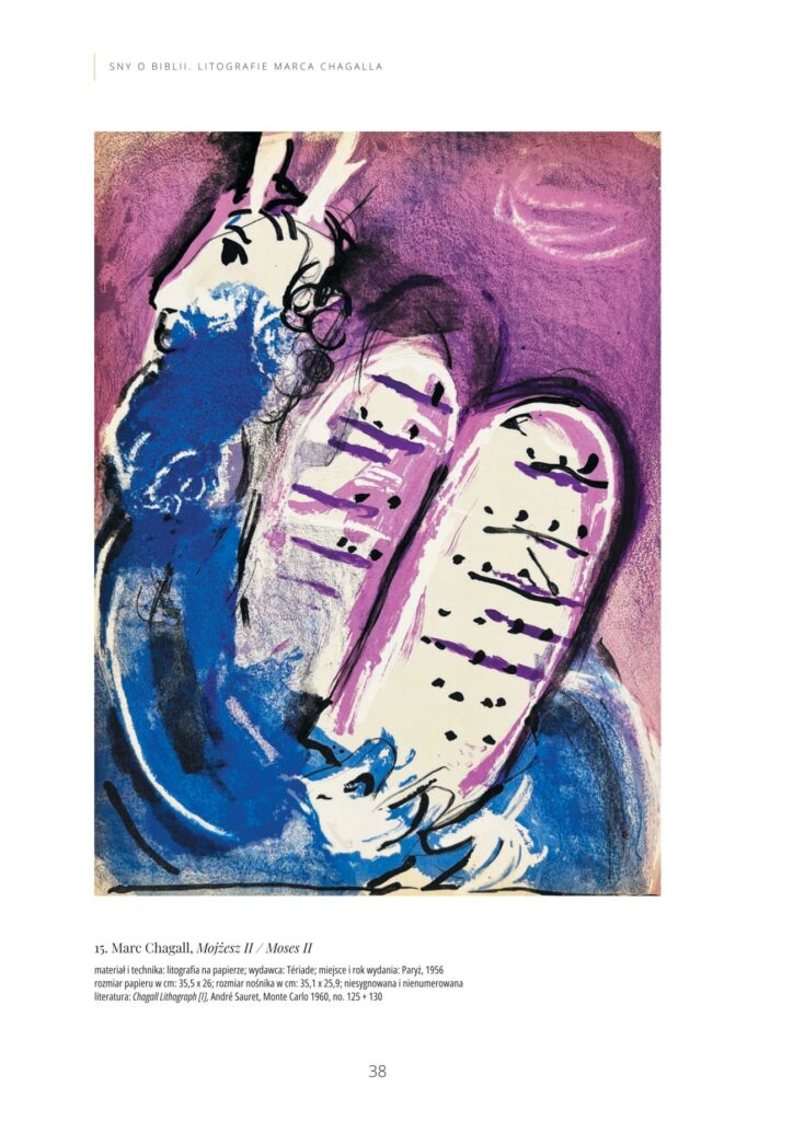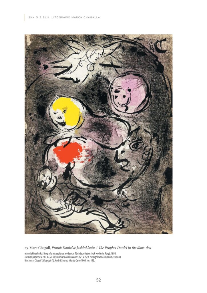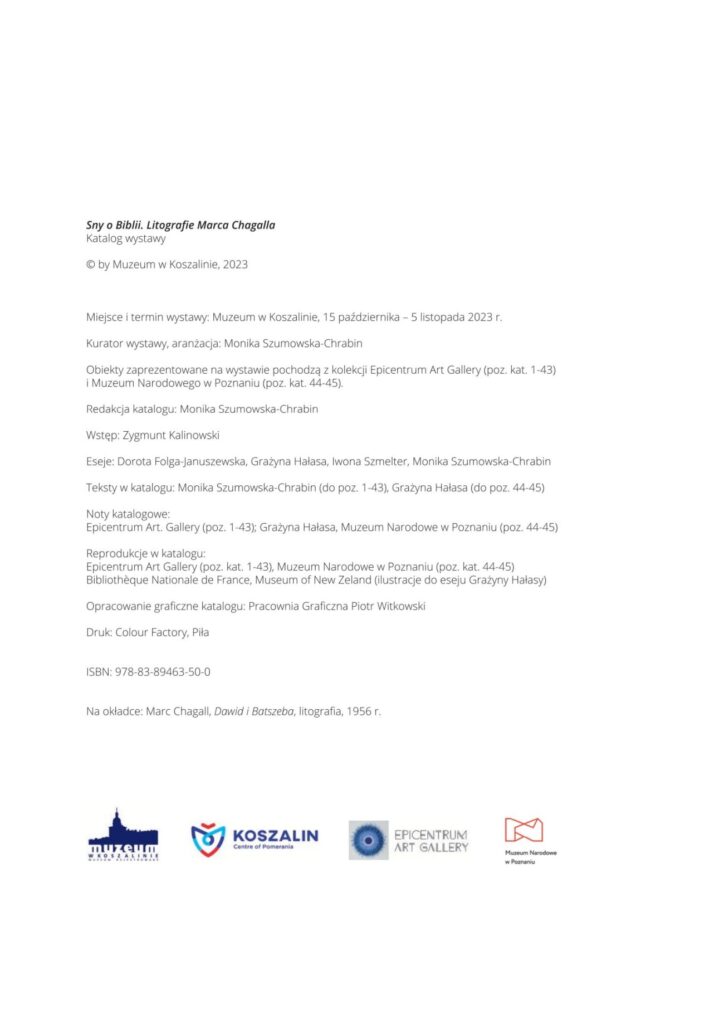 Katalog wystawy czasowej Marc Chagall „Sny o Biblii”, która prezentowana była w Muzeum w Koszalinie od 15 października do 5 listopada 2023 roku. Była to wystawa, na której zaprezentowano zestaw 41 litografii, po raz pierwszy opublikowanych w latach 1956 i 1960 przez francuskie czasopismo „Verve”.