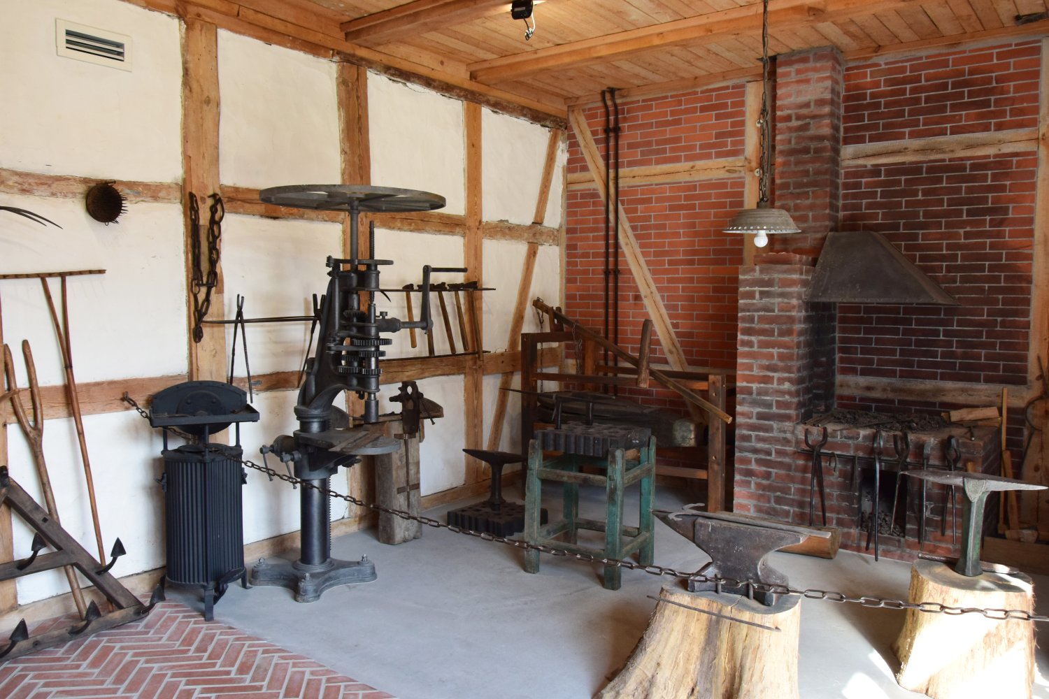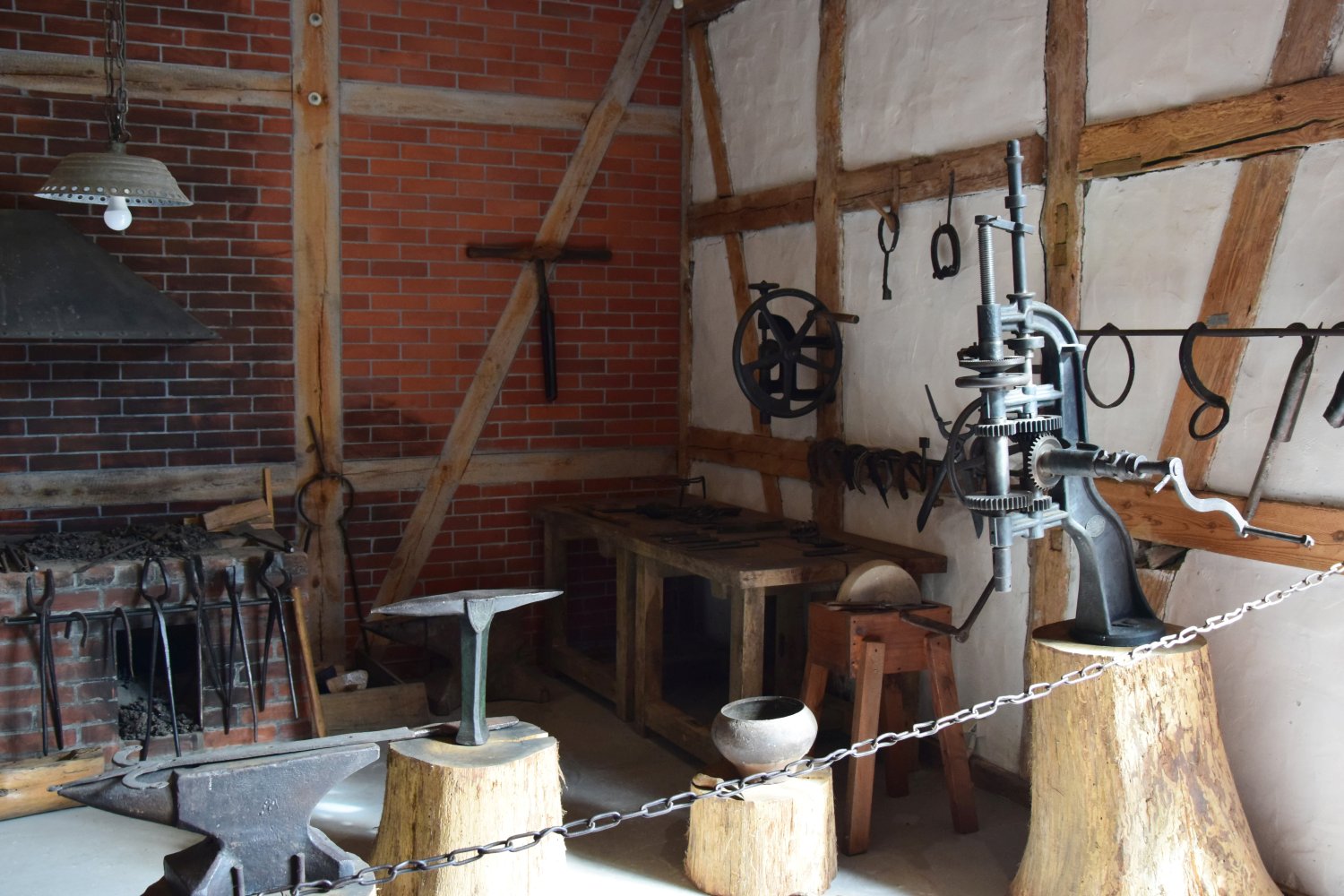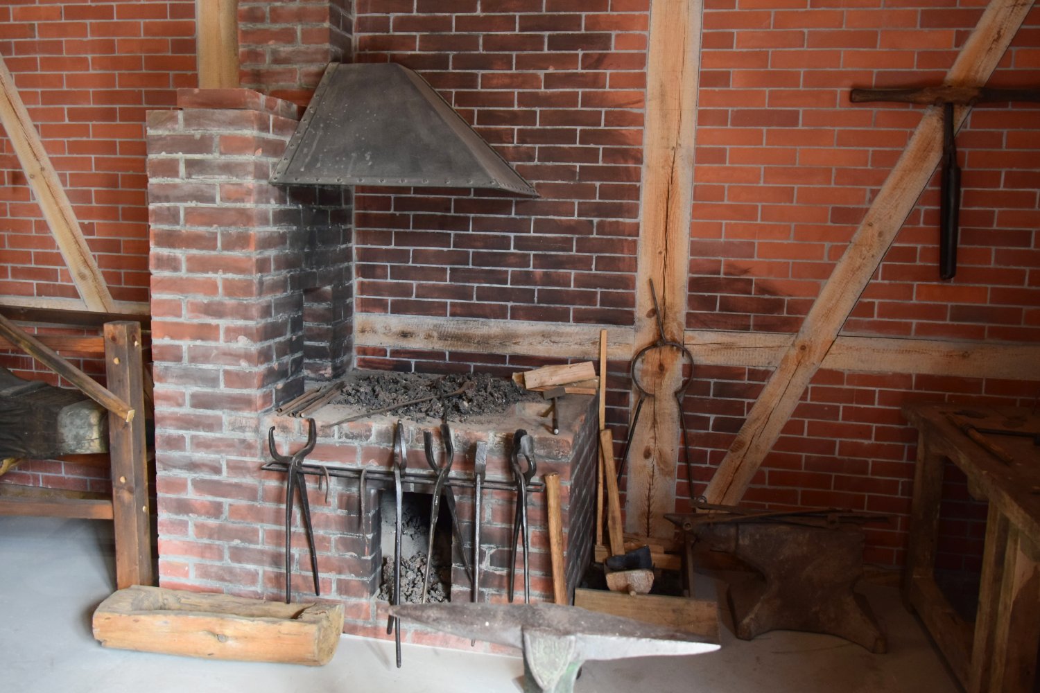 Przy ścianie, na prawo od paleniska ustawiono dwa stoły kowalskie – czyli „warsztat”, na którym kowal wykonywał większość prac oraz przechowywał narzędzia. Do warsztatu przytwierdzone jest duże imadło, nad nim dwie wiertarki przyścienne. Poniżej i powyżej, w obejmach, wytwory pracy kowala oraz różnego rodzaju drobne narzędzia. Wśród nich m.in. cyrkiel kowalski i suwmiarki. W centrum kuźni stoi jedno z najważniejszych narzędzi kowalskich – kowadło. Na nim kowal wykonywał obróbkę metalu.