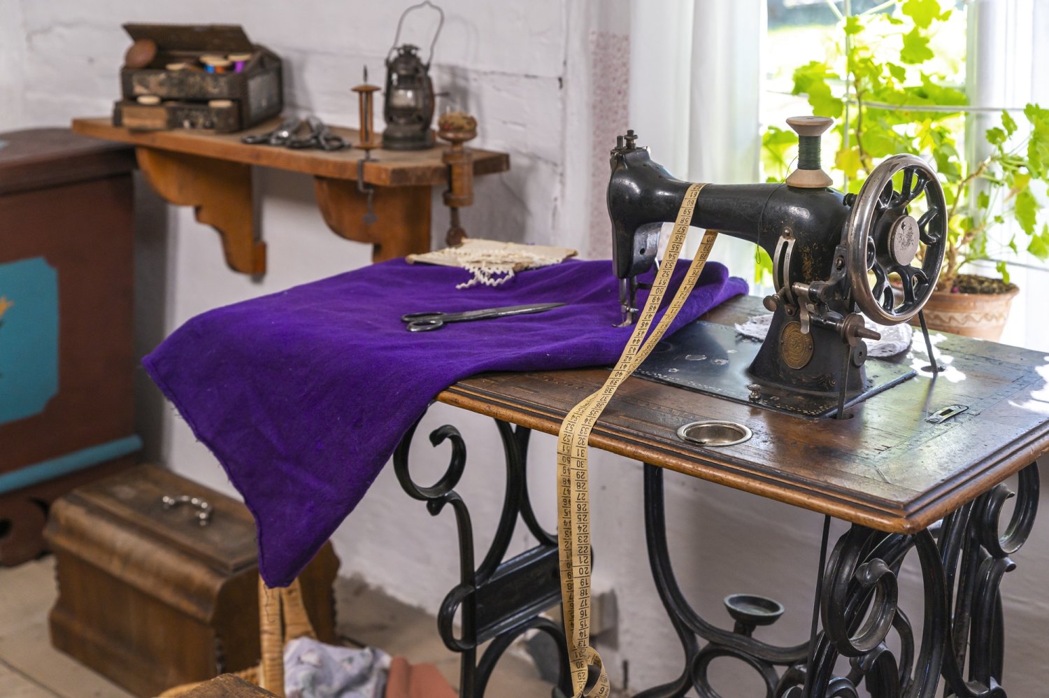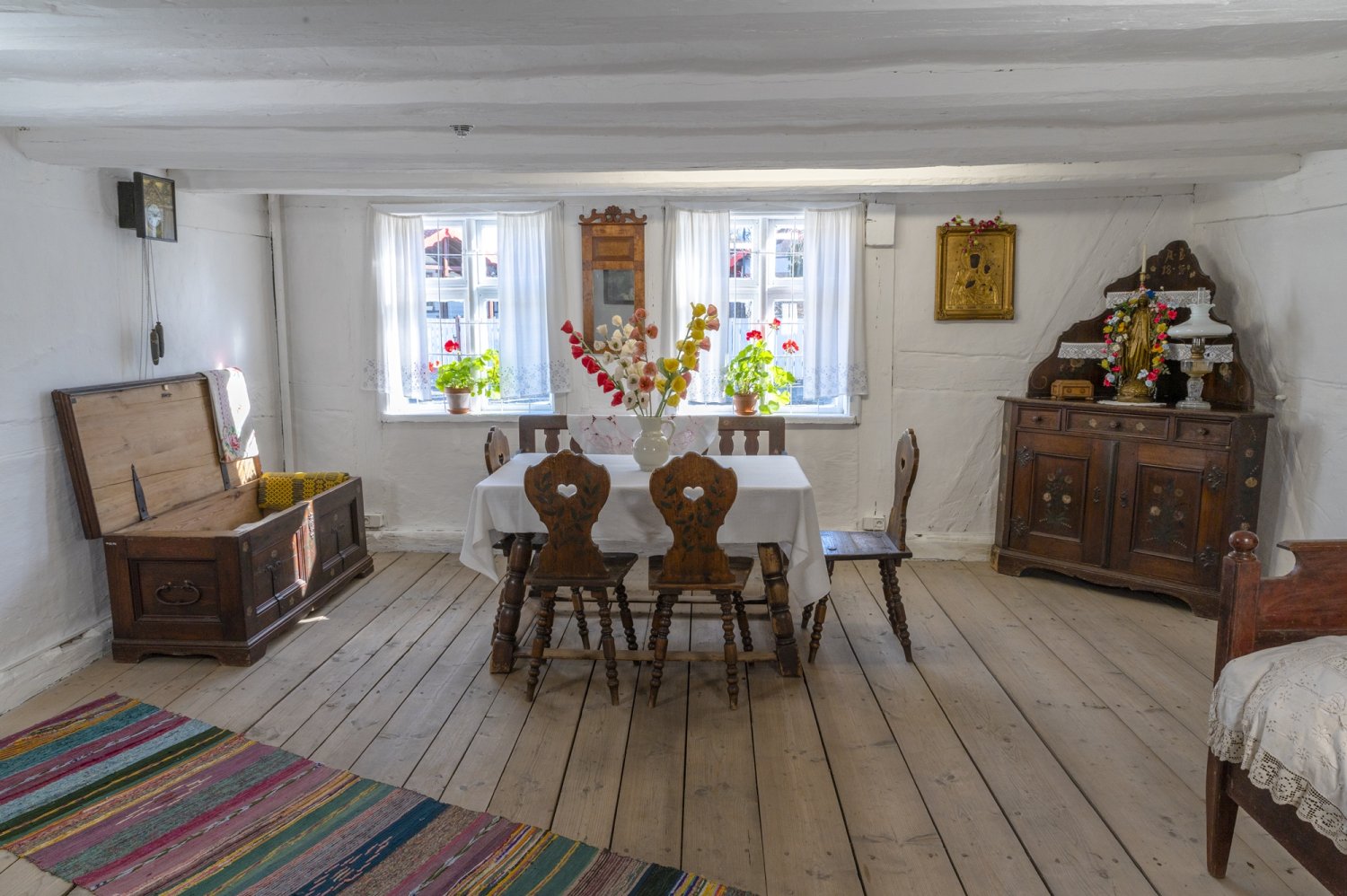Szczególnie charakterystyczne są szafa (kształt mebla jest typowy dla Pomorza Zachodniego) oraz ława o zabudowanych profilowanych bokach i ażurowym oparciu, nawiązująca swym kształtem do ław kościelnych. Meble ozdobione są polichromią z motywem roślinnym. Przetrwały i zachowały swe miejsce w chałupie ze względu na funkcjonalność i dekoracyjność. Towarzyszą im tkaniny. Na ścianach za łóżkami zawieszone są kilimy. Ręcznie tkane na krosnach, barwne i dynamiczne, przybyły tu z daleka – z północnych i wschodnich krańców Polski. Nie sposób pominąć ozdoby i ochrony podłogi, czyli chodników-szmaciaków. Do ich utkania wykorzystywano ścinki tkanin, futer, starą odzież… Pocięte paski wiązano lub zszywano w dłuższe kawałki, dobierając je kolorami.