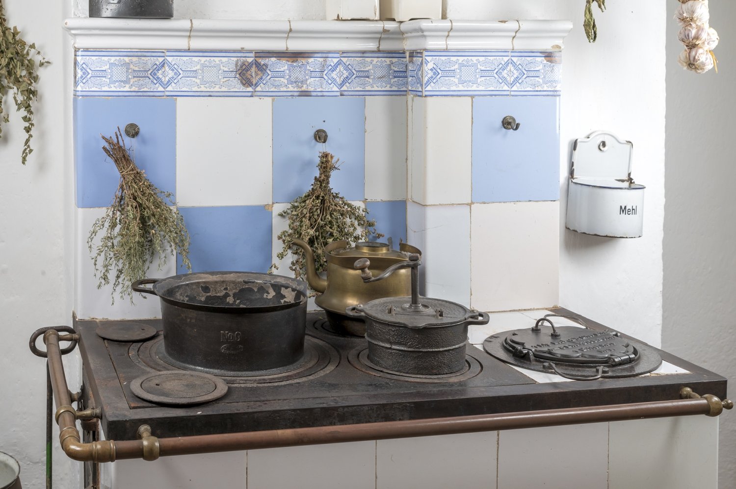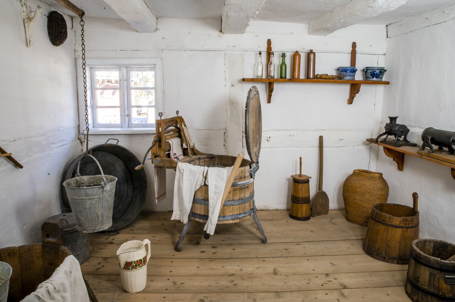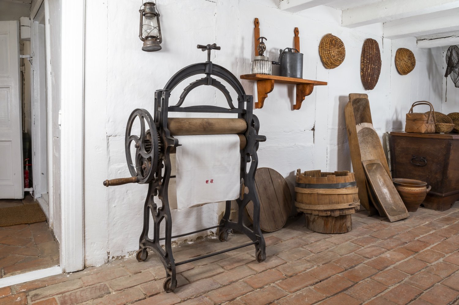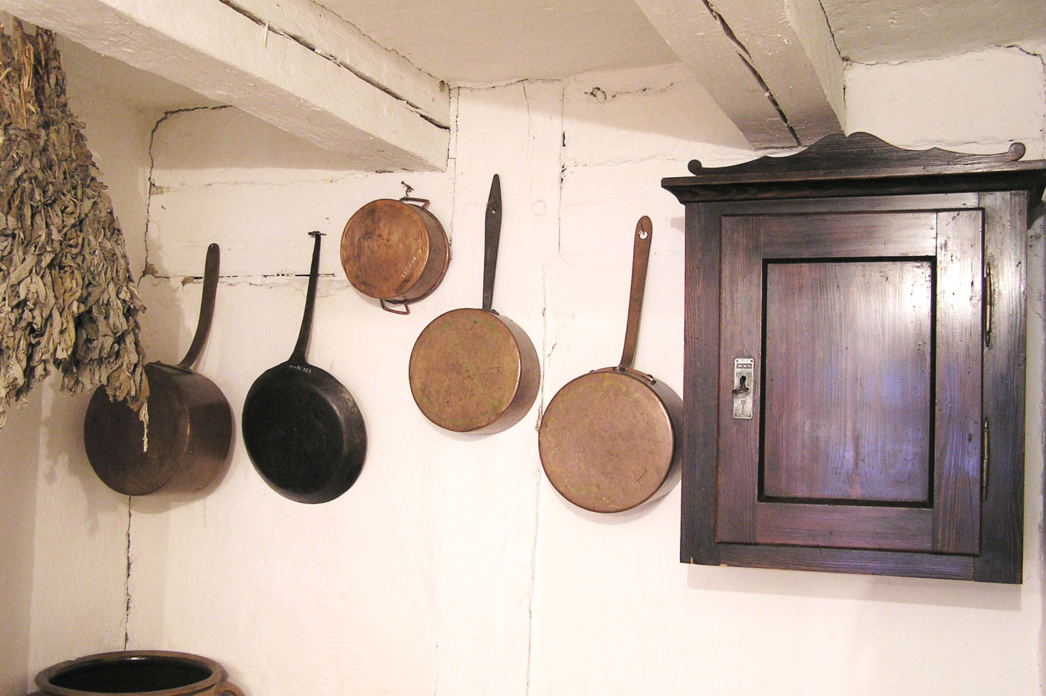 Kuchnia to szczególne pomieszczenie. To w niej skupiało się życie codzienne rodziny, przygotowywano posiłki oraz przetwarzano i konserwowano żywność, stąd tak duża ilość narzędzi i naczyń tym celom służących. Używane okazjonalnie wynoszono do komory, na strych bądź do sieni. Dzieże i niecki, koszyki do formowania bochenków czy łopaty do chleba znajdowały swoje miejsce w komorze. Również tam chroniły się formy do bab, foremki do masła, kamienne garnki i różnego rodzaju butelki szklane i gliniane. Także w komorze znajdują się sprzęty związane z higieną. Sień natomiast pełniła przede wszystkim funkcję komunikacyjną, ale wykorzystując jej znaczne rozmiary, przechowywano tu skrzynie, miary, kosze z ziarnami zbóż oraz żarna, w których mielono je na mąkę.