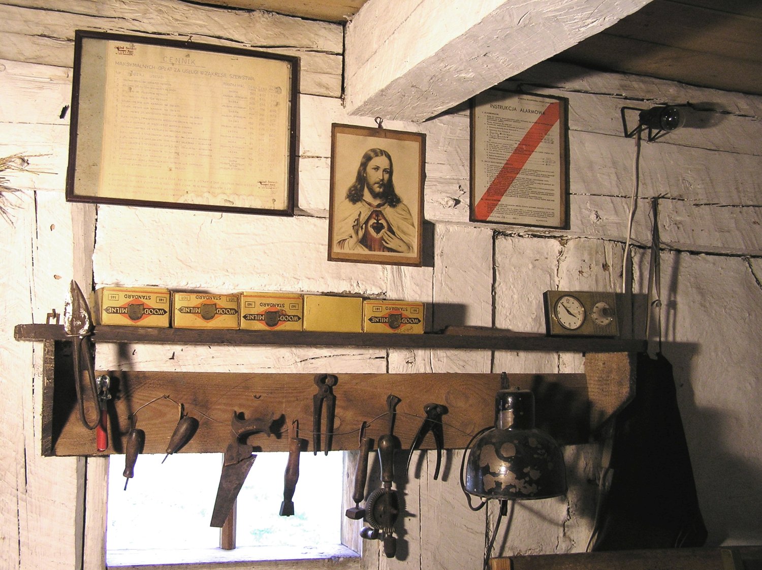 Przy drzwiach wejściowym, pod oknem stoi stół z uniesionym brzegiem i szufladami, na którym wyeksponowano drobne narzędzia do naprawy obuwia. Są wśród nich: młotek ze specjalnie uformowanym lekkim obuszkiem, zaopatrzony z jednej strony w duży płaski stalowy łebek, z drugiej w szpic przydatny przy wyjmowaniu gwoździ; mała ręczna piła, ambus – kowadełko służące do polerowania spodu podeszwy lub obcasa.