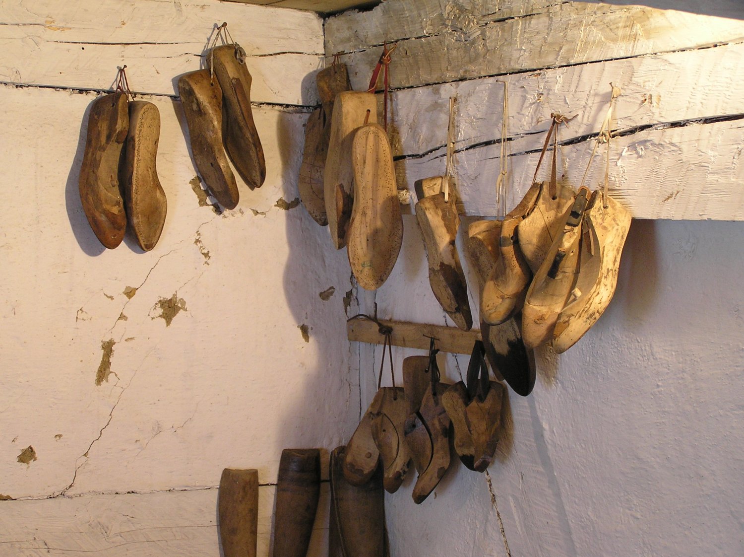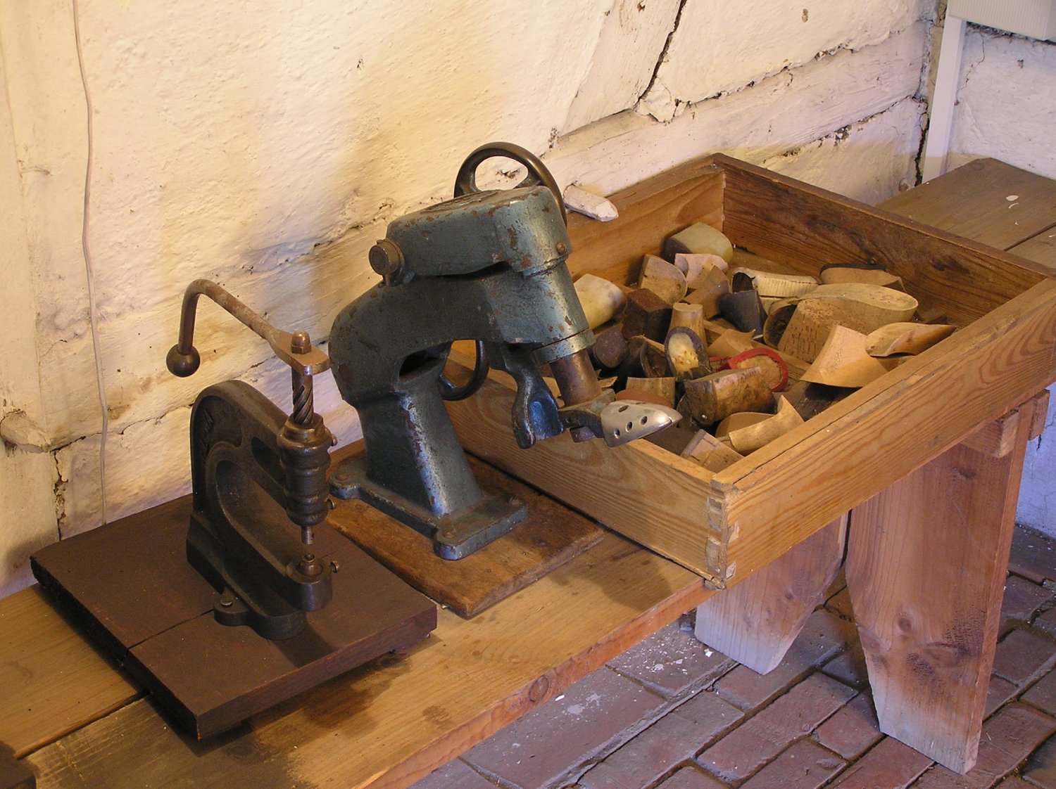 Dalej – bogata reprezentacja drewnianych, różnych rozmiarów kopyt świadcząca o tym, że szewc miał dużą grupę klientów, którym na miarę robił buty. Na wystawie prezentowana jest też maszyna do szycia (podobna do krawieckiej), która była niezbędna przy naprawie obuwia i służyła do szycia wierzchów, druga maszyna – z wydłużonym ramieniem – do szycia cholewek. Stojąca obok prasa szewska, z regulowaną śrubami siłą nacisku, służyła do dociskania (przy klejeniu) zelówki do wierzchu buta. Kolejna, niewielkich rozmiarów maszyna (do „oczek”) była niezbędna przy wykonywaniu dziurek pod nity i do sznurówek.